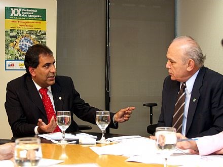 Brasília, 20/05/2008 - O presidente nacional da Ordem dos Advogados do Brasil, Cezar Britto, recebeu há pouco em audiência o secretário de Relações do Trabalho do Ministério do Trabalho e Emprego (MTE), Luiz Antonio de Medeiros, que fez uma exposição sobre a nova portaria nº 186 e pediu sugestões da OAB. A portaria trata dos novos procedimentos para uma entidade obter o registro sindical. Após a exposição, Britto informou a Luiz Medeiros que enviará o assunto para estudo e pronunciamento da Comissão Nacional de Direitos Sociais do Conselho Federal da OAB.