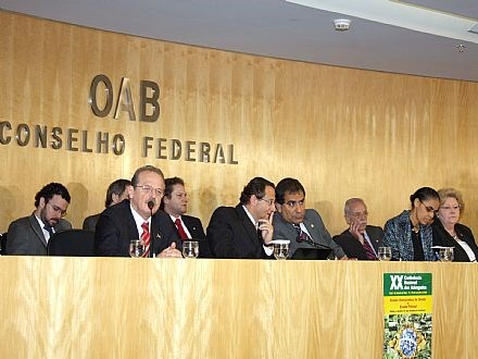Brasília, 10/06/2008 - O presidente nacional da Ordem dos Advogados do Brasil (OAB), Cezar Britto, acaba de abrir o debate público sobre soberania einternacionalização da Amazônia, realizado na sede da OAB, em Brasília. Estão presentes o ministro da Justiça, Tarso Genro, a ex-ministra do Meio Ambiente, senadora Marina Silva, o ex-ministro do Supremo Tribunal Federal e ex-juiz da Corte Internacional da Haia, Francisco Rezek, e o presidente da Fundação Nacional do Índio (Funai), Márcio Meira. Pela OAB, participam do debate toda a diretoria da entidade, os 81 conselheiros federais que integram o Pleno da OAB, o medalha Rui Barbosa da OAB, Fábio Konder Comparato, e o membro honorário vitalício da entidade, Mário Sérgio Duarte Garcia.