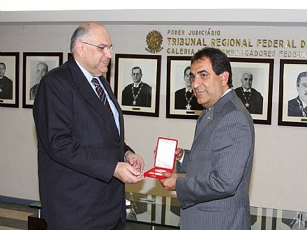 Brasília, 12/08/2008 - O presidente do Tribunal Regional Federal da Primeira Região, desembargador federal Jirair Aram Meguerian, concedeu, hoje (12), durante solenidade realizada no Salão Nobre, medalha e diploma de Visitante Ilustre ao presidente do Conselho Federal da Ordem dos Advogados do Brasil,Cezar Britto, em decorrência da passagem do Dia do Advogado. Estiveram presentes ao evento o ministro José Arnaldo da Fonseca, do STJ, desembargadores federais da Casa, juízes federais e a presidente da OAB do Distrito Federal,Estefânia Viveiros.