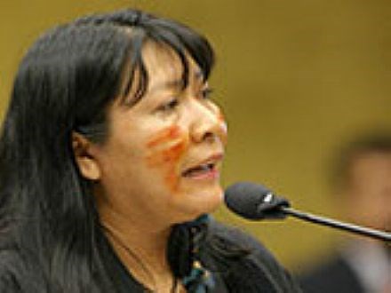 Brasília, 27/08/2008 - Pela primeira vez na história do Supremo Tribunal Federal, um índio sobe à tribuna para fazer uma sustentação oral. A estréia é de uma mulher: a advogada Joênia Batista de Carvalho, do povo Wapichana, de Roraima, e que integra o Grupo de Trabalho de Assuntos Indígenas do Conselho Federal da OAB. Pouco antes de falar aos 11 ministros, ela relia os pontos do texto escrito à mão, com algumas rasuras. Ali estava a defesa dos cerca de 19 mil índios que desejam viver na área integral da Raposa Serra do Sol.