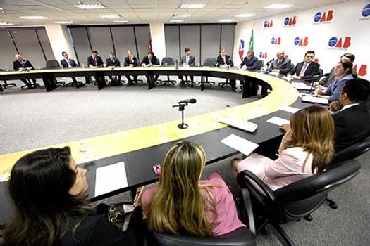 Brasília, 22/10/2008 - Sob a coordenação do presidente da Comissão Nacional de Legislação da OAB e conselheiro federal, Marcus Vinicius Furtado Coelho, mais de 40 advogados se reuniram hoje (22), na sede do Conselho Federal da OAB, com dois assessores do presidente do Supremo Tribunal Federal, ministro Gilmar Mendes, para tratar, pela primeira vez, do mecanismo da repercussão geral no recurso extraordinário. Ao abrir a reunião, Marcus Vinícius frisou que o STF, ao buscar a OAB para estabelecer um diálogo sobre o mecanismo, e a OAB, ao convidar os advogados para transmitir suas impressões sobre o tema, é um grande avanço. "Percebe-se a importância dos advogados e o interesse da OAB e do STF no aprimoramento das instituições jurídicas".