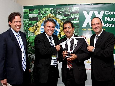 Natal (RN), 13/11/2008 - O presidente da Comissão Nacional de Acesso à Justiça da OAB Nacional; o conselheiro federal por Minas Gerais, João Henrique Café de Souza Novais, o conselheiro federal Evandro Pertence e o vice-presidente da OAB de Minas Gerais, Luiz Cláudio da Silva Chaves, entregaram hoje (13) ao presidente nacional da OAB, Cezar Britto, uma camisa oficial do Clube Atlético Mineiro. A entrega foi feita durante o intervalo da XX Conferência Nacional da entidade que está sendo realizada no Centro de Convenções de Natal com mais de cinco mil advogados e estudantes de direito. Torcedor do Vasco, do Rio de Janeiro, Britto recebeu a homenagem e lembrou que na noite desta quarta-feira o seu clube de coração foi derrotado pelo mineiro por quatro a um.