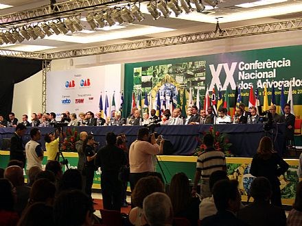 Natal (RN), 15/11/2008 - "Uma vitória da democracia". A afirmação foi feita hoje (15) pelo presidente nacional da Ordem dos Advogados do Brasil (OAB), Cezar Britto, ao conduziracerimônia de encerramento da XX Conferência Nacional dos Advogados e assistir a sessão do julgamento da anistia políticado ex-presidente da República, João Goulart. Britto lembrou que, durante cinco dias, mais de cinco mil advogados e estudantes de Direito de todo o país puderam acompanhar debates com as figuras mais importantes do mundo jurídico do país e de mais de quinze países de várias partes do mundo.