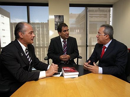 Brasília, 22/07/2009 - O presidente nacional da Ordem dos Advogados do Brasil (OAB), Cezar Britto, recebeu hoje (22), em seu gabinete, os advogados Jefferson Luis Kravchychyn, de Santa Catarina, e Jorge Hélio Chaves de Oliveira, do Ceará, que integrarão, no próximo biênio, a composição do Conselho Nacional de Justiça (CNJ). Eles informaram a Britto que participarão mensalmente das sessões plenárias do Conselho Federal da OAB e das reuniões do Colégio de Presidentes de Seccionais da OAB para prestar contas ao advogado. Os dois conselheiros indicados pela advocacia tomaram posse administrativamente nesta terça-feira. A posse solene será no próximo dia 3.