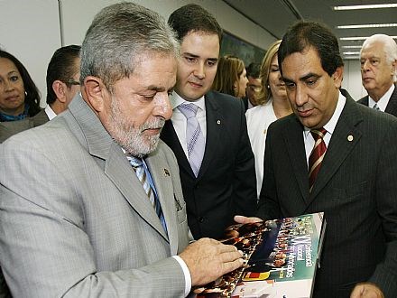 Brasília, 04/08/2009 - O presidente nacional da Ordem dos Advogados do Brasil (OAB), Cezar Brito, entregou hoje (04) ao presidente Luiz Inácio Lula da Silva, álbum com as fotos da XX Conferência Nacional dos Advogados, durante a qual foi realizado o julgamento do ex-presidente João Goulart, o Jango, pela Comissão de Anistia do Ministério da Justiça. A conferência foi promovida pela OAB na cidade de Natal (RN), em novembro do ano passado. Britto fez a entrega do álbum após a cerimônia em que o presidente Lula sancionou o projeto de lei de criação de 230 novas varas da Justiça Federal no País, a partir de 2010.