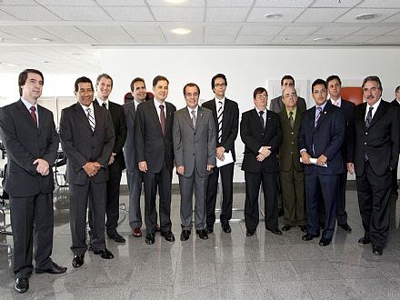 Brasília, 24/03/2010 - O presidente em exercício do Conselho Federal da Ordem dos Advogados do Brasil (OAB), Alberto de Paula Machado, recebeu hoje (24) a visita do presidente da Associação dos Juízes Federais do Brasil (Ajufe), Fernando de Mattos, juntamente com mais quinze juízes federais de todo o país. Durante a reunião, eles conversaram sobre a criação de mais quatro Tribunais Regionais Federais (TRFs) em Minas Gerais, no Paraná, na Bahia e no Amazonas, bem como a implantação de 230 Varas Federais distribuídas pelo país. Após a reunião na sede da OAB todos seguiram para a Esplanada dos Ministérios, onde serão recebidos em audiência pelo ministro do Planejamento, Paulo Bernardo.