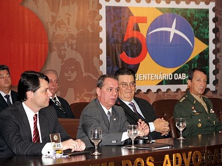 Brasília, 25/05/2010 - Representando o presidente nacional da Ordem dos Advogados do Brasil, Ophir Cavalcante, o diretor-tesoureiro do Conselho Federal da entidade, Miguel Cançado, participou hoje (25) pela manhã da sessão solene em comemoração aos 50 anos da Seccional da OAB do Distrito Federal, ao lado do presidente da OAB-DF, Francisco Caputo. O evento foi realizado na sede da OAB-DF, em Brasília.