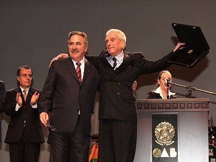 Curitiba (PR), 20/11/2011 - O presidente da Seccional da Ordem dos Advogados do Brasil (OAB) do Paraná, José Lúcio Glomb, fez hoje (20) a entrega de homenagem especial ao advogado Eduardo Rocha Virmond, que presidiu a entidade em 1978, data em que a VII Conferência Nacional dos Advogados foi realizada no Paraná. Naquela época, quando o Brasil vivia o auge da ditadura militar, com a vigência do Ato Institucional (AI) número 5, as principais demandas dos advogados eram a revogação dos atos institucionais, a reinstituição do habeas corpus e a concessão da anistia.
