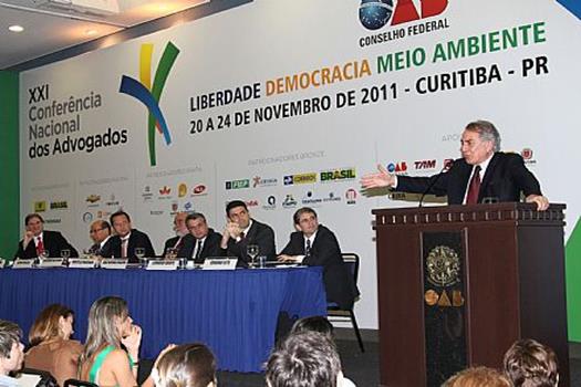 Curitiba (PR), 23/11/2011 - O artista não pode oferecer gratuitamente a sua obra a quem explora e aufere lucros a partir dela. "Isso tem acontecido no Brasil com a condescendência dos magistrados e não pode continuar ocorrendo". Essa foi a tônica da apresentação do ministro aposentado do Supremo Tribunal Federal e ex-juiz da Corte Internacional da Haia, Francisco Rezek, no painel sobre "Direito de Propriedade" na programação da XXI Conferência Nacional dos Advogados, realizada pelo Conselho Federal da OAB nesta capital.