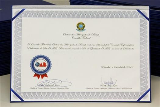 Dos atuais 1.210 cursos existentes no Brasil, apenas 89 cursos de instituições de ensino brasileiras – o equivalente a 7,3% do total – acabaram sendo recomendados e vão receber a outorga do Selo OAB como cursos de destacada qualidade, dentro de critérios objetivos aplicados pela Comissão Especial da entidade para sua elaboração. A lista dos cursos que receberão o Selo foi divulgada pela OAB durante a sua XXI Conferência Nacional, em novembro de 2011 na cidade de Curitiba.