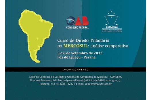Brasília – O Conselho Federal da Ordem dos Advogados do Brasil (OAB) e o Conselho de Colégios e Ordens de Advogados do Mercosul (Coadem) realizam, nos dias 5 e 6 de setembro deste ano, em Foz do Iguaçu, no Paraná, o Curso de Direito Tributário no Mercosul: Análise Comparativa. O vice-presidente do Conselho Federal da OAB, Alberto de Paula Machado, participará da abertura do evento.