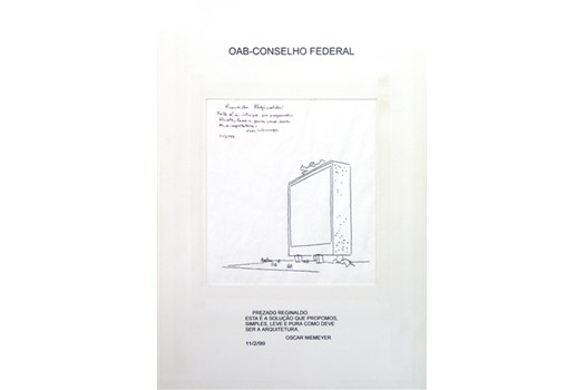 Reginaldo de Castro - O desenho arquitetônico e artístico da fachada do prédio, ou seja, a forma do prédio, o marco zero da obra, foi inteiramente doado por Oscar Niemeyer à OAB. Logo depois de nossa visita ao Rio, Niemeyer me mandou um esboço manuscrito, o qual até hoje guardo com enorme carinho, propondo um desenho de fachada que é exatamente esta que está construída e cujo prédio abriga, hoje, a sede da OAB Nacional. Nesse manuscrito, ele escreveu “Prezado Reginaldo: esta é a solução que propomos, simples, leve e pura, como deve ser a arquitetura”. A fachada da OAB, ao que nos parece e como a vemos hoje, é uma continuação do céu de Brasília. Para mim, é a continuação do símbolo da paz, da seriedade e da ética.