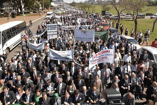 Apoiada por 170 entidades e empunhando faixas com críticas à PEC 12 e à não quitação dos precatórios, a marcha percorreu em silêncio, sob um sol escaldante, os três quilômetros entre a sede do Conselho Federal da OAB e o Congresso Nacional, passando pela Esplanada dos Ministérios.