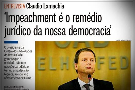Na época do ex-presidente Fernando Collor de Mello, ele não tinha base política, partidária e ideológica tão firme quanto o atual governo tem hoje, e isso faz com que se tenha agora um enfrentamento e uma resistência maior. Mas entendo que a OAB ganha protagonismo por propor um exame mais abrangente que o processo que está correndo com um trabalho feito de forma técnica, célere e com a oportunidade de um debate amplo na classe e no aspecto jurídico. O partido da OAB é o Brasil, e sua ideologia, a Constituição. A Ordem não é governo, nem oposição, é do cidadão. Enquanto for presidente, quero deixar claro que partido não entra.