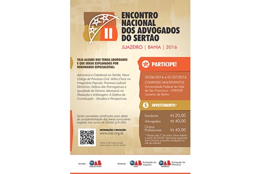 O II Encontro Nacional dos Advogados do Sertão é uma realização da OAB Nacional com as Seccionais da Bahia e de Pernambuco, além das subseções de Juazeiro (BA) e Petrolina (PE).