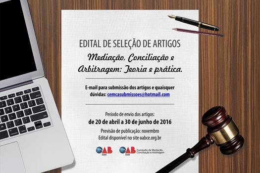 Brasília (DF) e Fortaleza (CE) – A seccional cearense da OAB está com edital de seleção aberto a fim de selecionar artigos para publicação no livro “Mediação, Conciliação e Arbitragem: Teoria e Prática”. O prazo segue até o dia 30 de junho e os textos devem ser enviados para o e-mail cemcasubmissoes@hotmail.com.