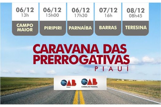Brasília (DF) e Teresina (PI) – A Caravana Nacional das Prerrogativas, iniciativa do Conselho Federal da OAB pela promoção da dignidade profissional da advocacia, chega nesta terça-feira (6) à seccional piauiense. A comitiva passará por Campo Maior, Piripiri, Parnaíba, Barras e a capital Teresina.