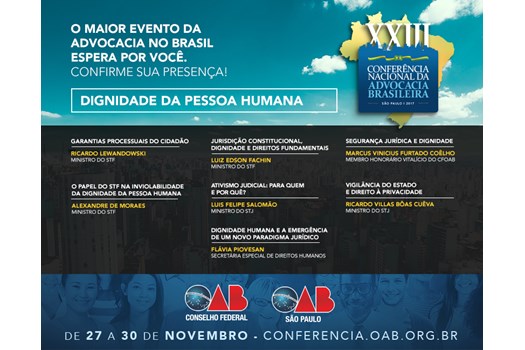A XXIII Conferência Nacional da Advocacia Brasileira será realizada entre os dias 27 e 30 de novembro de 2017, na cidade de São Paulo. O tema deste ano é “Em defesa dos direitos fundamentais: pilares da democracia, conquistas da cidadania”. A Conferência é realizada em parceria entre o Conselho Federal da OAB e a Seccional de São Paulo.