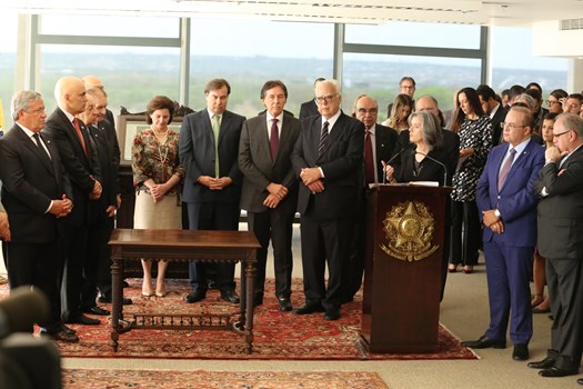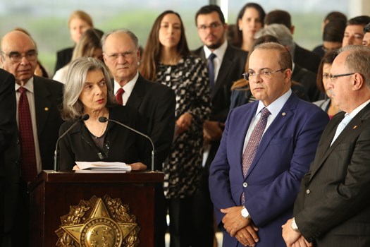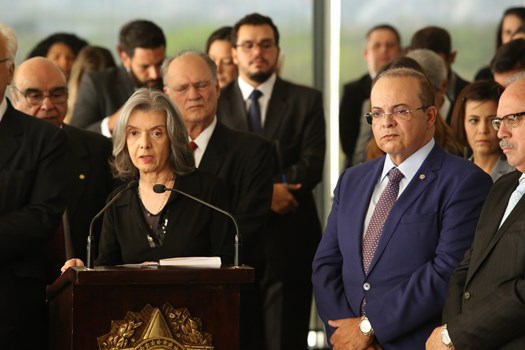 “Tendo a honra de presenciar essa solenidade que une os poderes Judiciário e Legislativo, não temos dúvida em afirmar que o Brasil vive uma verdadeira democracia, amparada na combinação de independência e harmonia entre os poderes e suas instituições republicanas”, discursou Eunício de Oliveira, presidente do Senado, no evento.