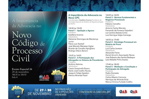 O evento especial “A Importância da Advocacia no Novo CPC” será realizado na sala 4, com capacidade para 400 pessoas, e é aberto a todos os inscritos da XXIII Conferência Nacional da Advocacia Brasileira.