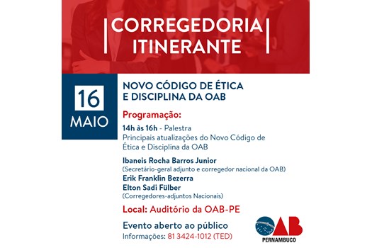 Às 16h30, será realizada uma reunião interna com a presença dos representantes da Corregedoria-Geral do Conselho Federal da OAB, do presidente da seccional – Ronnie Preuss Duarte, da diretoria do Tribunal de Ética e Disciplina da OAB-PE e dos membros da Corregedoria local.