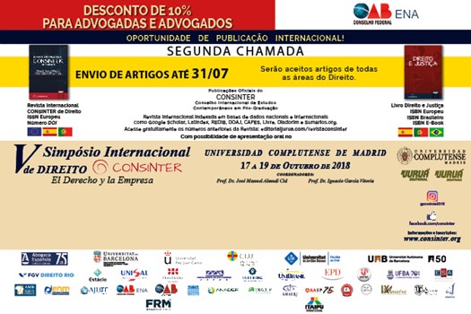 Brasília (DF) – Estão abertas as inscrições para o V Simpósio Internacional de Direito do Consinter (Conselho Internacional de Estudos Contemporâneos em Pós-Graduação), instituição com a qual a Escola Nacional da Advocacia (ENA) tem convênio. Advogadas e advogados regularmente inscritos na OAB têm 10% de desconto no valor da inscrição.