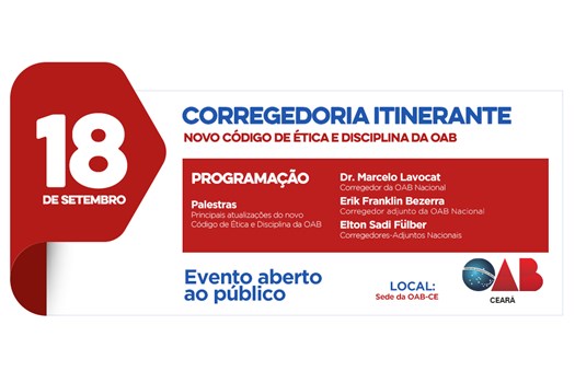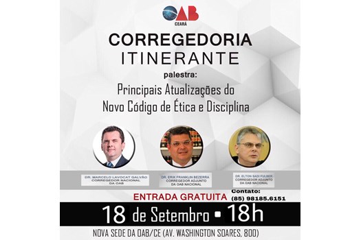 Brasília - A Seccional cearense da OAB receberá na próxima terça-feira, dia 18 de setembro de 2018, o projeto “Corregedoria Itinerante”, uma ação da Corregedoria-Geral do Conselho Federal da Ordem que visa esclarecer a advocacia sobre as atualizações do novo Código de Ética e Disciplina (CED).