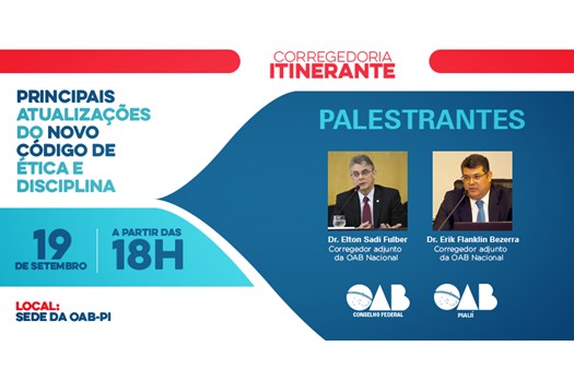 Brasília - A Seccional piauiense da OAB receberá na próxima quarta-feira, dia 19 de setembro de 2018, o projeto “Corregedoria Itinerante”, uma ação da Corregedoria-Geral do Conselho Federal da Ordem que visa esclarecer a advocacia sobre as atualizações do novo Código de Ética e Disciplina (CED).