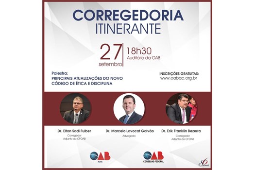 Brasília - A Seccional acreana da OAB receberá na próxima quinta-feira, dia 27 de setembro de 2018, o projeto “Corregedoria Itinerante”, uma ação da Corregedoria-Geral do Conselho Federal da Ordem que visa esclarecer a advocacia sobre as atualizações do novo Código de Ética e Disciplina (CED).