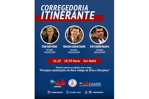 Brasília - A Seccional roraimense da OAB receberá na próxima terça-feira, dia 16 de outubro de 2018, o projeto “Corregedoria Itinerante”, uma ação da Corregedoria-Geral do Conselho Federal da Ordem que visa esclarecer a advocacia sobre as atualizações do novo Código de Ética e Disciplina (CED).
