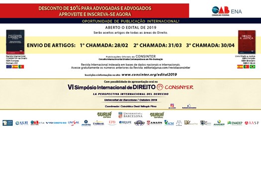 Advogadas e advogados terão 10% de desconto na taxa de inscrição. Serão aceitos os trabalhos com os seguintes temas: direitos difusos, coletivos e individuais homogêneos; direito público; direito privado; e direito internacional. Os artigos devidamente inscritos até 30 de abril de 2019 e aprovados para as publicações oficiais do CONSINTER poderão ser apresentados oralmente pelo autor/coautor sem custo adicional no VI Simpósio Internacional de Direito CONSINTER - Universitat de Barcelona, que se realizará em outubro de 2019.