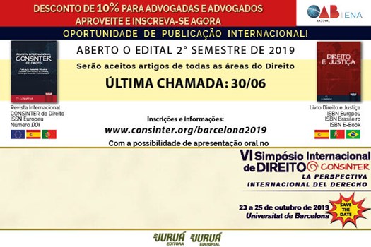 Brasília – Termina no próximo dia 30 de junho o prazo para envio de artigos para publicação nas obras oficiais do Conselho Internacional de Estudos Contemporâneos em Pós-Graduação (Consinter), com quem a Escola Nacional de Advocacia (ENA) do Conselho Federal da OAB tem convênio. Os textos completos dos artigos devem ser enviados para o e-mail contato@consinter.org.