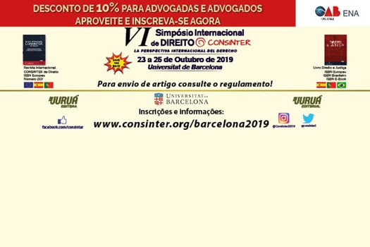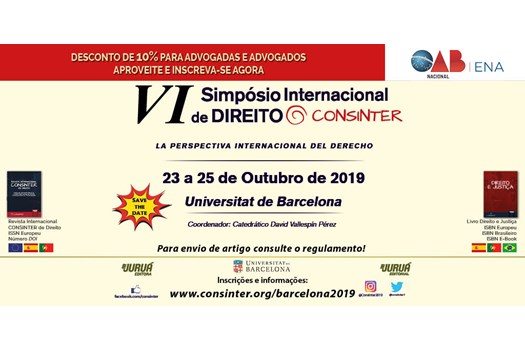 O VI Simpósio Internacional de Direito do Consinter acontecerá em Barcelona, na Espanha, de 23 a 25 de outubro de 2019. A Escola Nacional de Advocacia (ENA) do Conselho Federal da OAB tem convênio com o Consinter, parceria que possibilitou o envio – até 30 de junho – de artigos para publicação nas obras oficiais do evento.