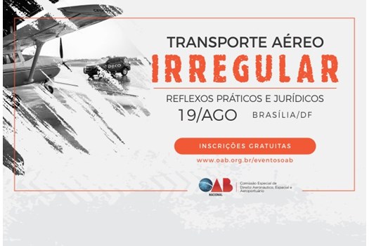 A Comissão Especial de Direito Aeronáutico, Espacial e Aeroportuário promove, no dia 19 de agosto, em Brasília, o seminário "Transporte Aéreo Irregular: Reflexos Práticos e Jurídicos". O evento abordará temas de relevância referente a uma das práticas mais perigosas e criminosas da aviação civil brasileira. As inscrições são gratuitas e podem ser realizadas na página de eventos da OAB.