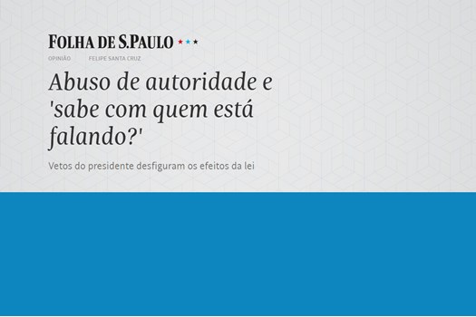 A Folha de S.Paulo publicou, neste domingo (22), artigo de autoria do presidente da OAB Nacional, Felipe Santa Cruz, sobre a Lei de Abuso de Autoridade. Clique aqui para ler no site da Folha ou veja abaixo a íntegra do artigo: