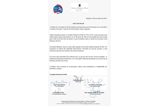 A Ordem dos Advogados do Brasil manifesta profundo pesar pelo falecimento do ex-presidente e Membro Honorário Vitalício da OAB Eduardo Seabra Fagundes e, nesse momento de consternação, oferece suas condolências e solidariedade aos familiares e amigos. O presidente nacional da OAB, Felipe Santa Cruz, decretou luto oficial por três dias.