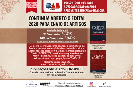 As apresentações orais dos artigos científicos aprovados e o VII Simpósio Internacional de Direito Consinter, que ocorreriam no mês de outubro, em Madri, estão suspensos, prezando pela saúde e bem estar de todos, atendendo orientações da Organização Mundial de Saúde e demais órgãos competentes, que agem no intuito de prevenir e interromper a propagação da Covid-19. As futuras decisões serão tomadas considerando a situação mundial da pandemia.