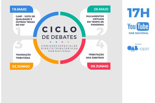 A OAB Nacional promove, a partir desta terça-feira (19), o Ciclo de Debates da Comissão Especial de Direito Tributário do CFOAB. Serão quatro temas nas próximas semanas: o primeiro, nesta terça-feira, "CARF: Voto de Qualidade e outros temas do PAF"; o segundo, no dia 26 de maio, discutirá "Julgamentos Virtuais em tempo de Pandemia"; o terceiro, em 2 de junho, debaterá "Transação Tributária"; e o último, marcado para o dia 9 de junho, terá o tema "Tributação dos Árbitros". Todos serão realizados a partir das 17 horas.