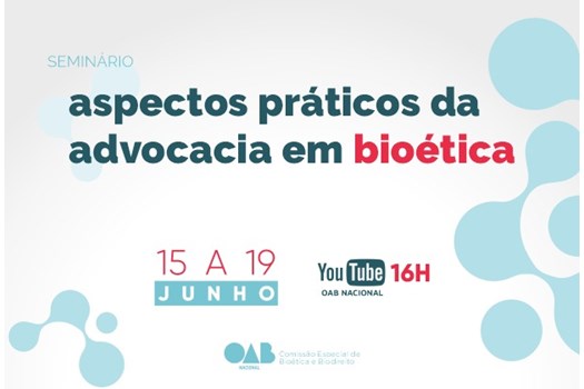 A OAB Nacional, por meio de sua Comissão Especial de Bioética e Biodireito, promove, no período de 15 a 19 de junho, o Seminário Aspectos Práticos da Advocacia em Bioética. Ao longo de cinco dias, o evento trará temas variados em formato de aulas, transmitidas ao vivo no canal oficial do YouTube OAB Nacional. Não é necessário realizar inscrição para o evento virtual, basta acessar o canal nos dias e horários do evento.