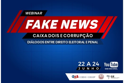 A OAB Nacional, por meio das Comissões de Direito Eleitoral e de Garantia do Direito de Defesa, promove o webinar “Fake News, Caixa Dois e Corrupção. Diálogos entre Direito Eleitoral e Penal”. O evento será realizado entre os dias 22 e 24 de junho e terá transmissão ao vivo dos painéis e debates pelo canal oficial da OAB Nacional no YouTube.