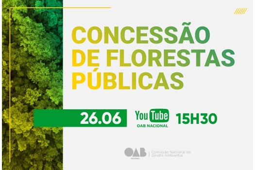 A OAB Nacional, por meio de sua Comissão Nacional de Direito Ambiental, promove no dia 26 de junho o evento "Concessão de Florestas Públicas". O evento ocorrerá das 15h30 às 16h30 e será transmitido ao vivo no canal oficial da Ordem no YouTube. Não é necessário realizar inscrição basta acessar o canal no horário do evento.
