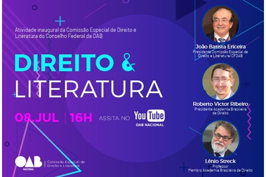 A OAB Nacional promove um webinar para debater Direito e Literatura. O evento marcará a instalação oficial da nova Comissão Especial de Direito e Literatura da Ordem. A discussão terá a participação do presidente da Academia Brasileira de Direito, Roberto Victor Ribeiro e do professor e membro da Academia Brasileira de Direito, Lênio Streck.