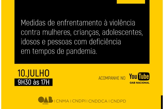 Dia 10 de julho é dia de debater um tema muito importante no contexto da pandemia e caro para a OAB. A Ordem promove o debate Medidas de Enfrentamento à Violência contra Mulheres, Crianças, Adolescentes, Idosos e Pessoas com Deficiência em Tempos de Pandemia. O evento, totalmente online, é realizado por meio das comissões nacionais da Mulher Advogada; de Defesa dos Direitos da Pessoa com Deficiência; de Defesa dos Direitos da Criança e do Adolescente; e de Defesa dos Direitos da Pessoa Idosa.