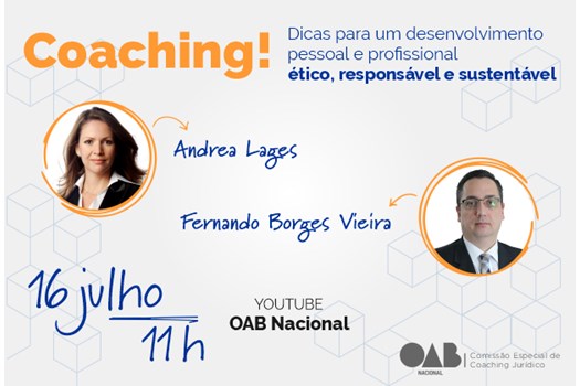 A OAB Nacional, por meio de sua Comissão Especial de Coaching Jurídico, promove no dia 16 de julho o evento virtual "Coaching - dicas para um desenvolvimento pessoal e profissional ético, responsável e sustentável". O evento é gratuito e não é necessário realizar inscrição. Basta acessar o canal da OAB Nacional no Youtube no dia e horário do evento, que começa às 11h.