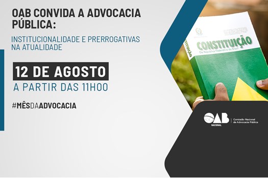 A Comissão Nacional de Advocacia Pública da OAB Nacional realizará, na próxima quarta-feira, dia 12 de agosto, o webinar “OAB Convida a Advocacia Pública: Institucionalidade e Prerrogativas na Atualidade”. O evento ocorrerá em plataforma digital (Zoom) e será transmitido em tempo real para o Youtube e Instagram da OAB Nacional, das 9h às 16h.