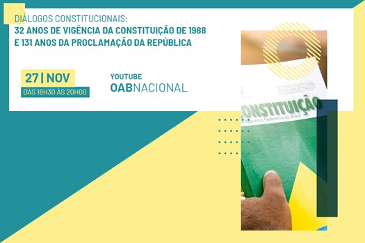 A OAB Nacional, por meio da Comissão Nacional de Defesa da República e da Democracia (CNDRD), promoverá o webinário “Diálogos Constitucionais: 32 anos de vigência da Constituição de 1988 e 131 anos de proclamação da República”. O evento será no dia 27 de novembro, a partir das 18h30min, e será transmitido pelo canal da OAB Nacional no YouTube.