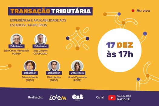 A OAB Nacional, em parceria com Instituto Direito para um Estado Melhor, promoverá o evento virtual “Transação Tributária - experiência e aplicabilidade aos Estados e Municípios”, no dia 17 de dezembro, a partir das 17h. Especialistas discutirão características e especificidades do instrumento da transação tributária aplicada às Unidades da Federação e às municipalidades. O evento será transmitido no canal da OAB Nacional no Youtube, sem necessidade de inscrição prévia.