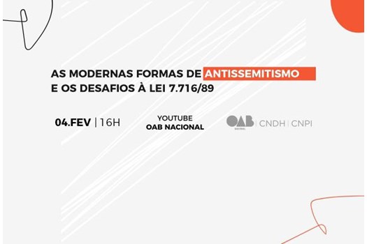 A OAB Nacional, por meio da Comissão Nacional de Promoção da Igualdade (CNPI) e da Comissão Nacional de Direitos Humanos (CNDH), promove o evento “As Modernas Formas de Antissemitismo: Desafios à Lei 7716/89”, com o objetivo de debater ações, normas e legislações de combate a diversas formas de antissemitismo no Brasil. O evento ocorrerá no dia 4 de fevereiro, às 16h, e será transmitido ao vivo no canal da OAB Nacional no YouTube.