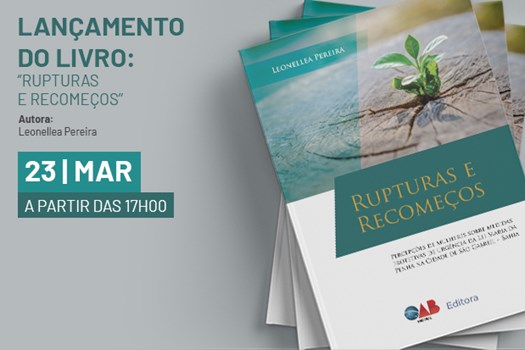 A OAB Nacional, através da OAB Editora, vai realizar o lançamento do livro “Rupturas e Recomeços - Percepções de Mulheres sobre medidas protetivas de urgência da Lei Maria da Penha na cidade de São Gabriel – Bahia”, da advogada Leonellea Pereira. O evento será virtual e ocorrerá no dia 23 de março, às 17h, podendo ser acompanhado em tempo real pelo canal da OAB Nacional no YouTube.