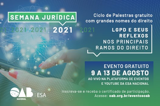 A ESA Nacional promoverá uma série de eventos virtuais que fazem parte da "Semana Jurídica 2021 - LGPD e seus reflexos nos principais ramos do Direito". Serão cinco dias de palestras com a realização de 19 painéis comandados por profissionais consagrados que farão um apanhado das alterações trazidas pela LGPD, bem como o seu reflexo nos principais ramos do Direito.